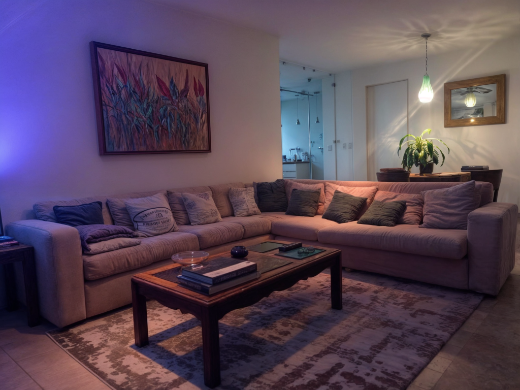 El depto. 1106 cuenta con un amplio salón-comedor luminoso y panorámico, ideal para cenas con amigos o tardes de lectura en familia. La ventana de piso a techo inunda de luz natural, creando una atmósfera elegante.
